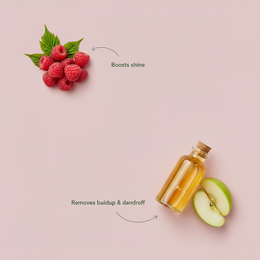 Apple cider vinegar to clarify and rebalance. Raspberry extract to boost shine and freshness. Salicylic acid to gently exfoliate buildup.